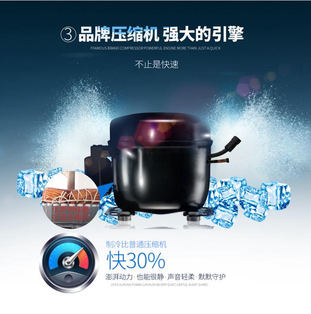 品牌压缩机,制冷超迅速;无氟制冷剂,节能环保还省电,高效利用每一度电。可控旋钮温控器,让您随心所欲掌控内里温度;内部还配备有可拆卸网篮,大大方便您的货物分类。均匀散热口的存在,能一直让压缩机处于较佳状态,时刻保持内部温度。